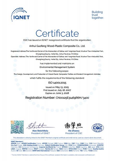 スタンダード:ISO9001 番号:00122Q33631R5M/3400 発行日:2022-05-26 有効期限:2025-05-28 範囲/範囲:Design,Development and production of wood plastic profiles で発行:CQC |